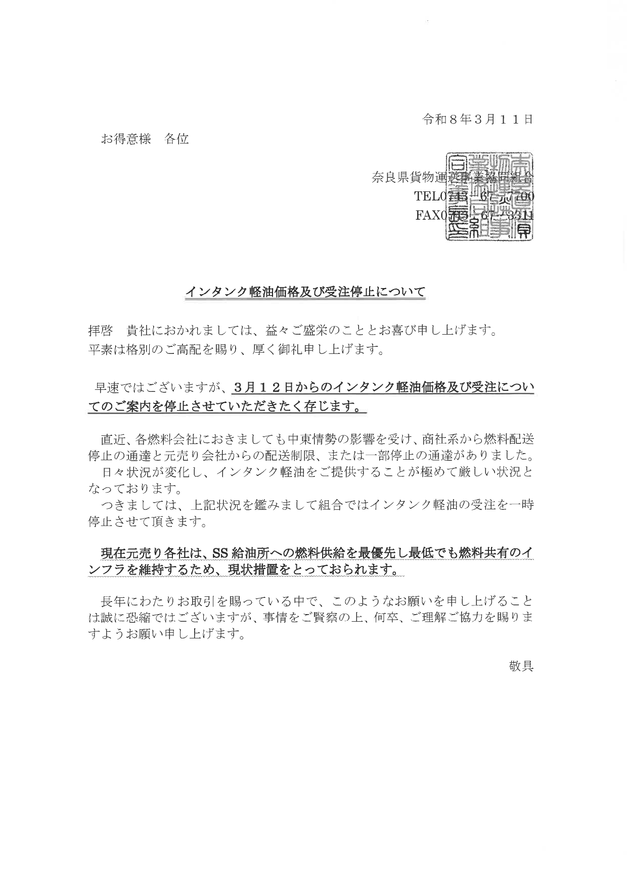 各軽油会社からインタンク配送停止の為、受注の停止も3月12日から行わさせていただきます。